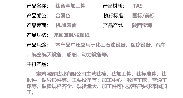 寶雞盛輝鈦業(yè)有限公司主營(yíng)鈦棒,鈦加工件,鈦標(biāo)準(zhǔn)件,鈦鍛件,鈦異