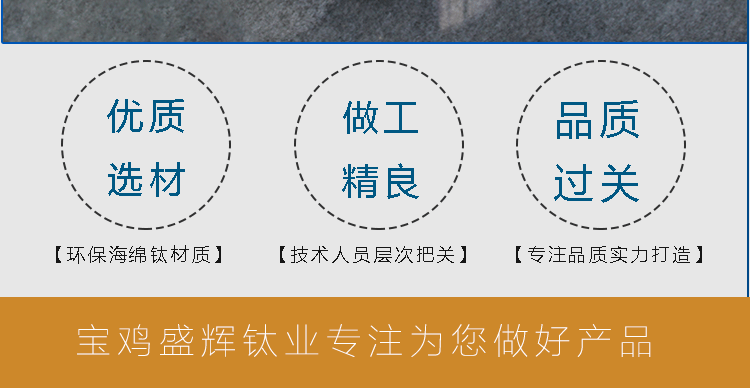 從細節出發,站在專業的角度,始終如一品質的最終使用價值,產品和服務同時送達盛輝鈦業客戶的承諾。寶雞盛輝,將以不變的摯誠,用心聆聽,貼心關懷,以至全至尊的服務,與新老客戶攜手共贏!